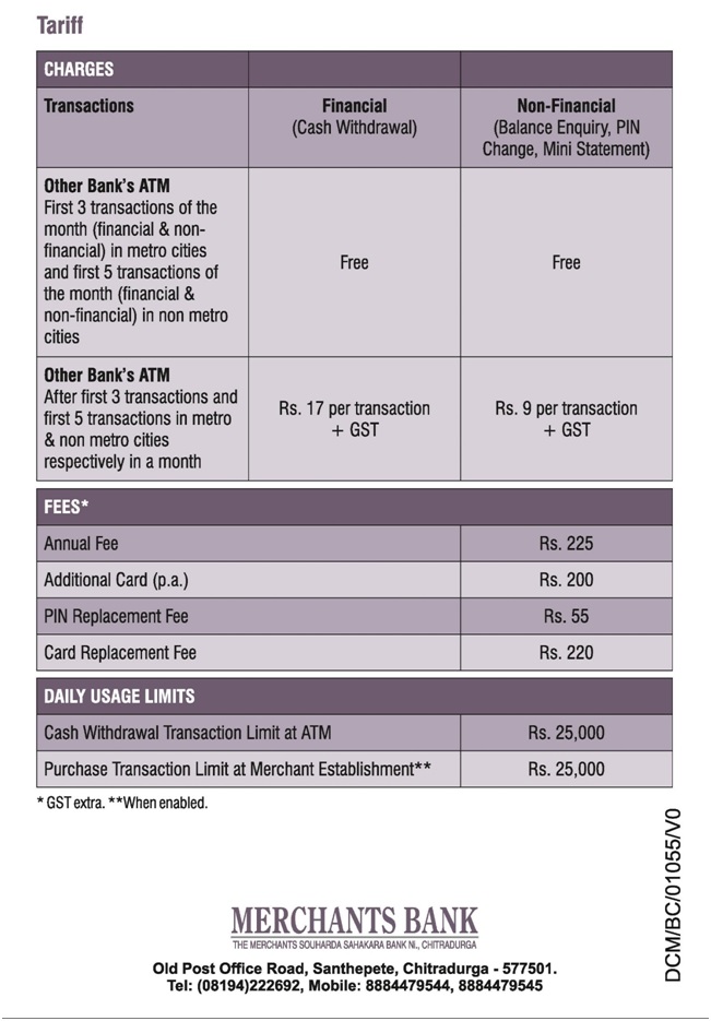 The RuPay Debit Card, as the name suggests, will provide you access not only to Merchants Bank Chitradurga., ATMs but also other banks’ ATMs and Merchant Establishments across India that display the RuPay logo. You can use your card to withdraw money (limited to daily withdrawal limit) from your account anytime, anywhere at your convenience. You can also check Account Balance, change PIN and print a Mini Statement. Kindly read the User Guide and the Terms & Conditions carefully before using the card.