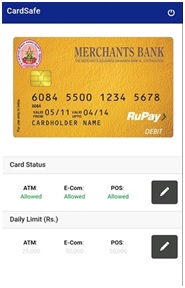 1.Log into Sarvatra Cardsafe you will see Merchants Bank RuPay Debit card with masked card no and name on screen.